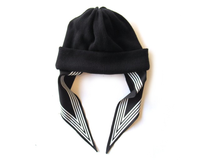 ニットキャップのサイドにスカーフを取り付けました。着用した際に垂らしても良し、スカーフを内側に折り込みシンプルに着用も出来ます。 本体、スカーフ:cotton 100% Size - One Size *手作業での採寸と加工の縮みによる若干の誤差はご了承下さい。