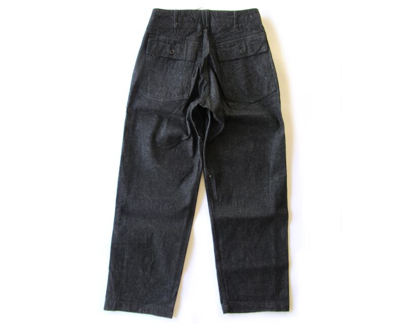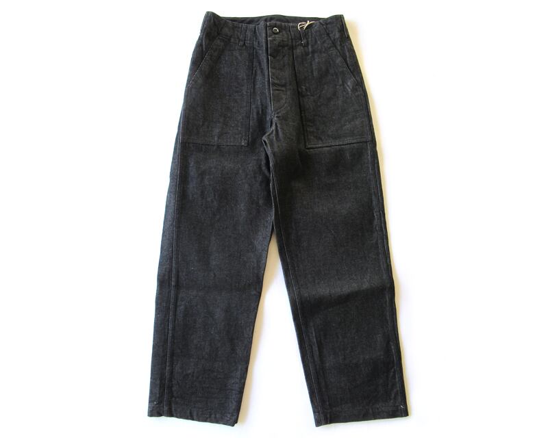 14oz Cone Denimを使用したファティーグパンツです。ゆとりがあり、少しテーパードしたシルエットとなります。ウエストの内側には、平紐のコードがございます。
