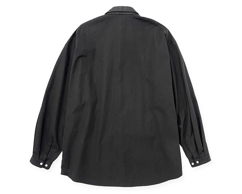 衿にリアルレザーを使用したオーバーサイズシャツです。製品洗い加工を入れ、衿もキズや色ムラを避けずに加工し、風合いを出しています。