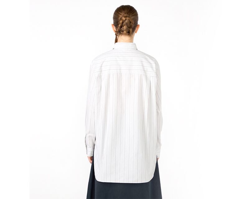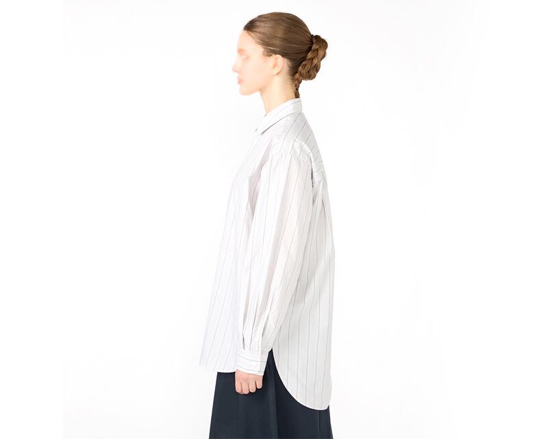ポリエステルの外側をオーガニックコットンで覆った二層構造のカバーリングコアヤーンを使用し、高密度に織り上げたブロードクロスを使用した長袖シャツです。コットンの肌触りに、軽量且つ耐久性があり乾きやすいという機能性をプラスしたnanamicaオリジナルのハイブリッド素材です。