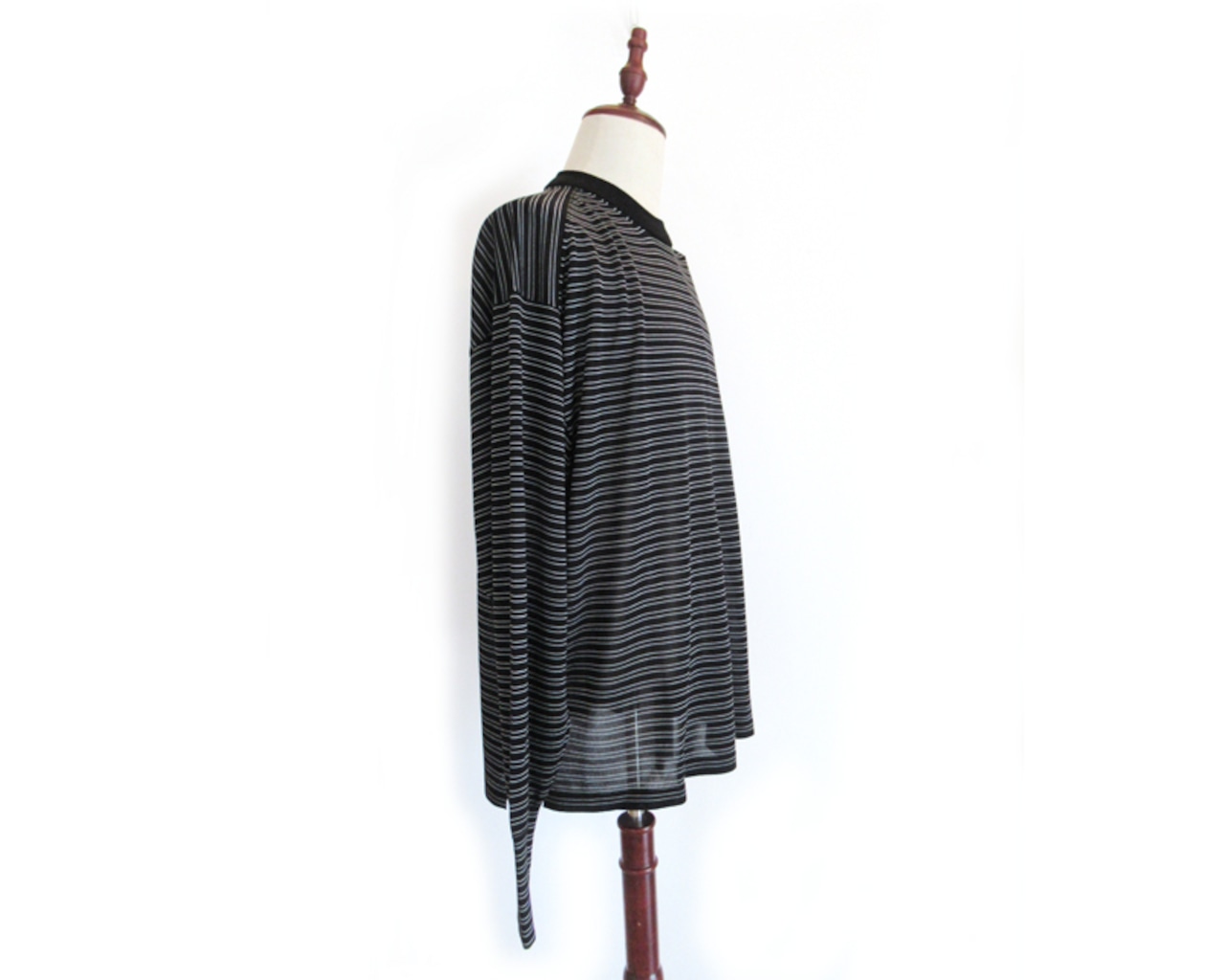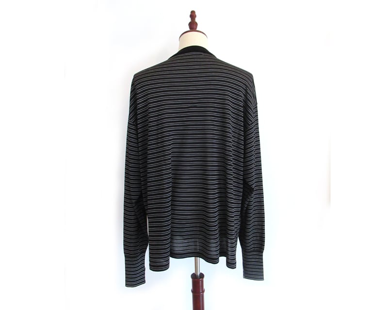 再生繊維(セルソース)、レーヨンをミックスした糸を使用。抗菌、冷感の機能も兼ね備えています。ハイゲージな天竺編みにして程よい光沢感を出し、滑らかな肌触りにしています。襟は針抜きリブ仕様にしています。程よい身幅のシルエットです。